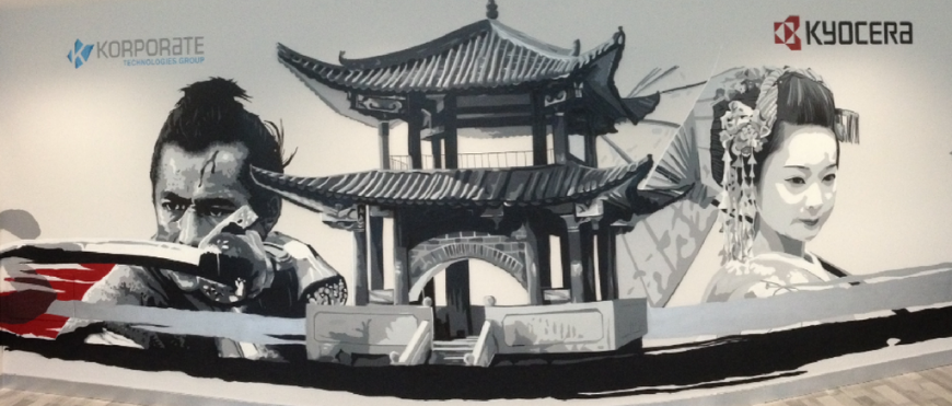 Realizados por la compañía Graffity Company, en las nuevas oficinas vuelven a estar representados tanto el Samurai, como la Geisha, tan presentes ya en las distintas delegaciones de Korporate Technologies en España, incitando a realizar un viaje tanto al desarrollo de la creatividad, como a tener una visión más renovada del futuro, pero sobre todo a la entrega y disciplina de la que hacían alarde esos guerreros, cuyo nombre viene de la palabra ‘saburau’ que significa “servir” .